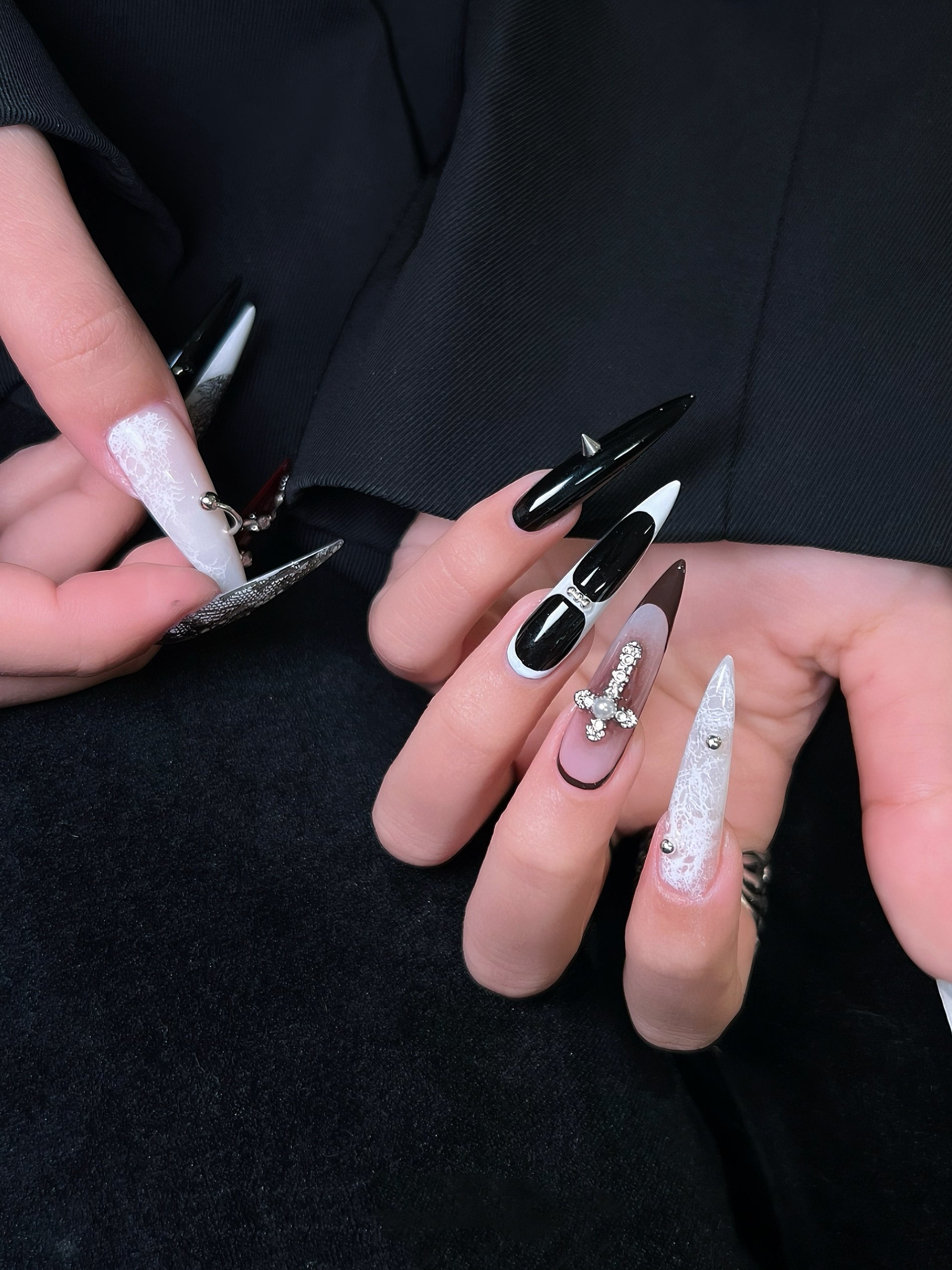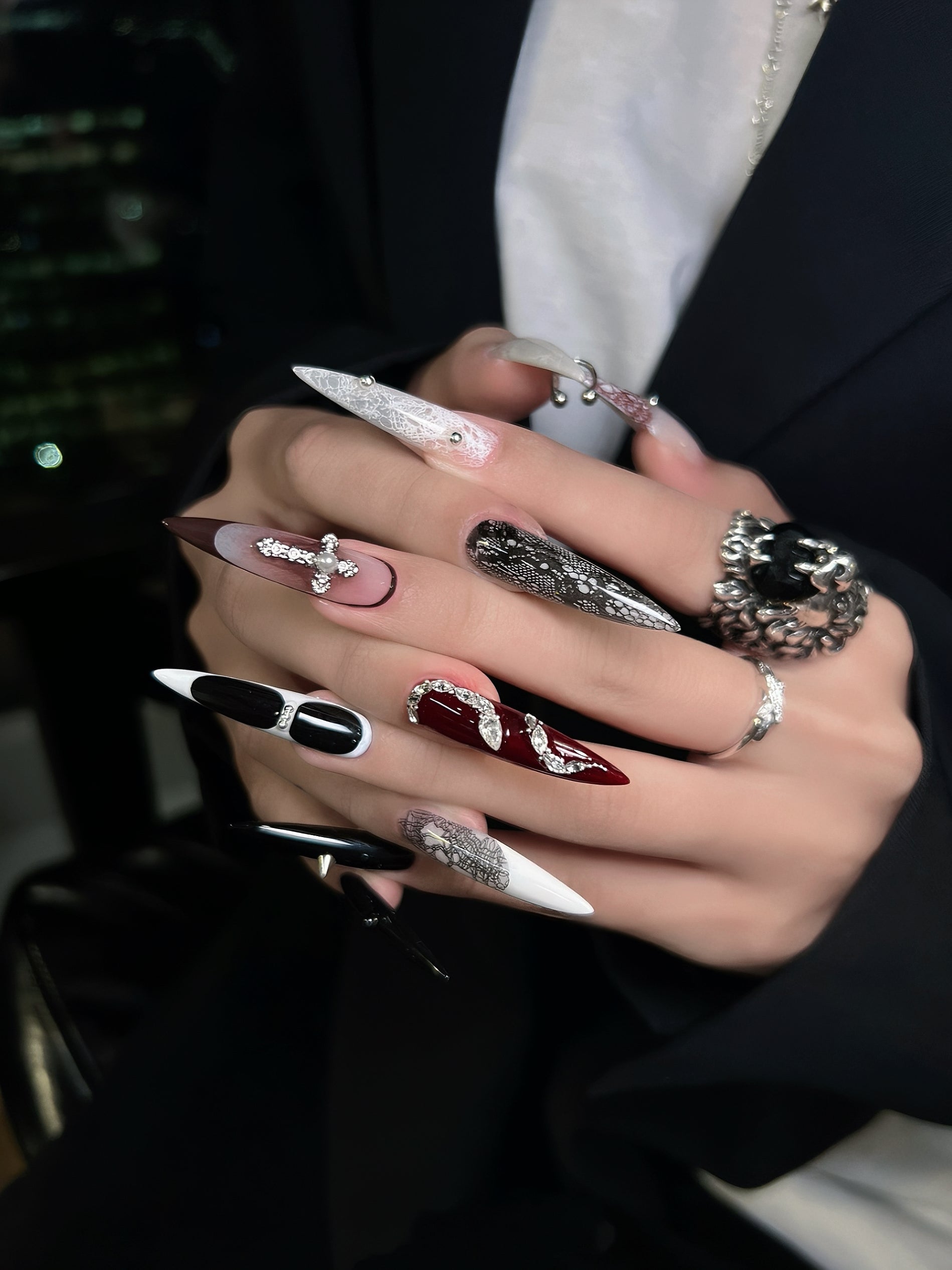 An edgy symphony of contrast and detail — featuring laser-etched lace foil, piercing-grade nail loops, and hand-stacked serpentine rhinestones.