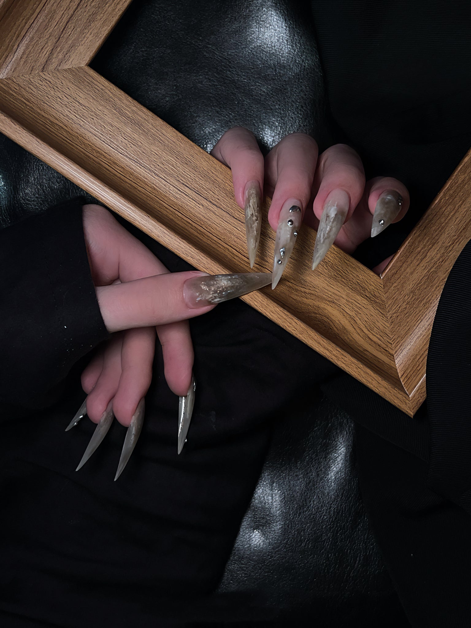 The stiletto shape enhances its relic-like edge, while high-gloss enamel softens the rawness — a contrast between preservation and power.