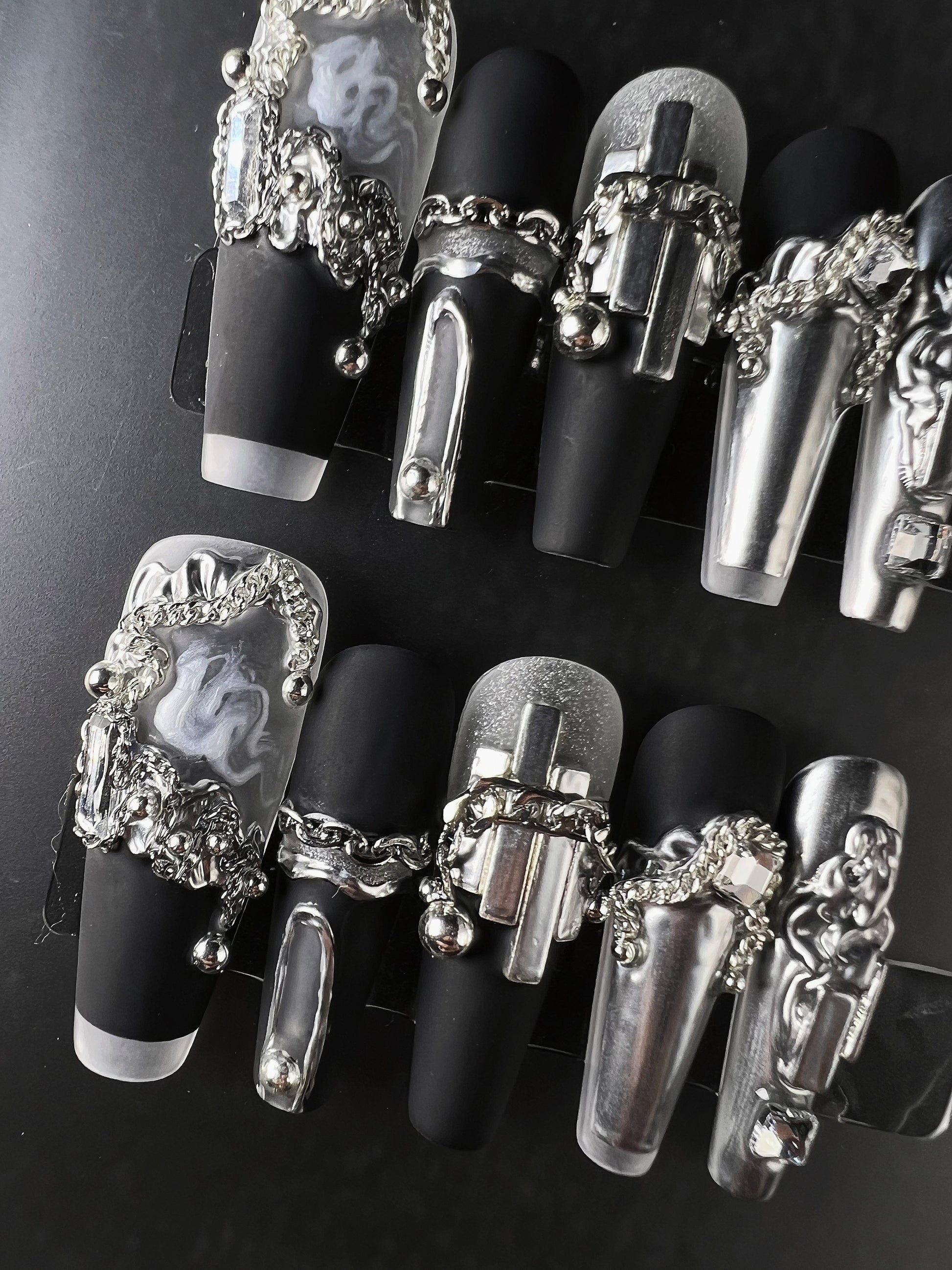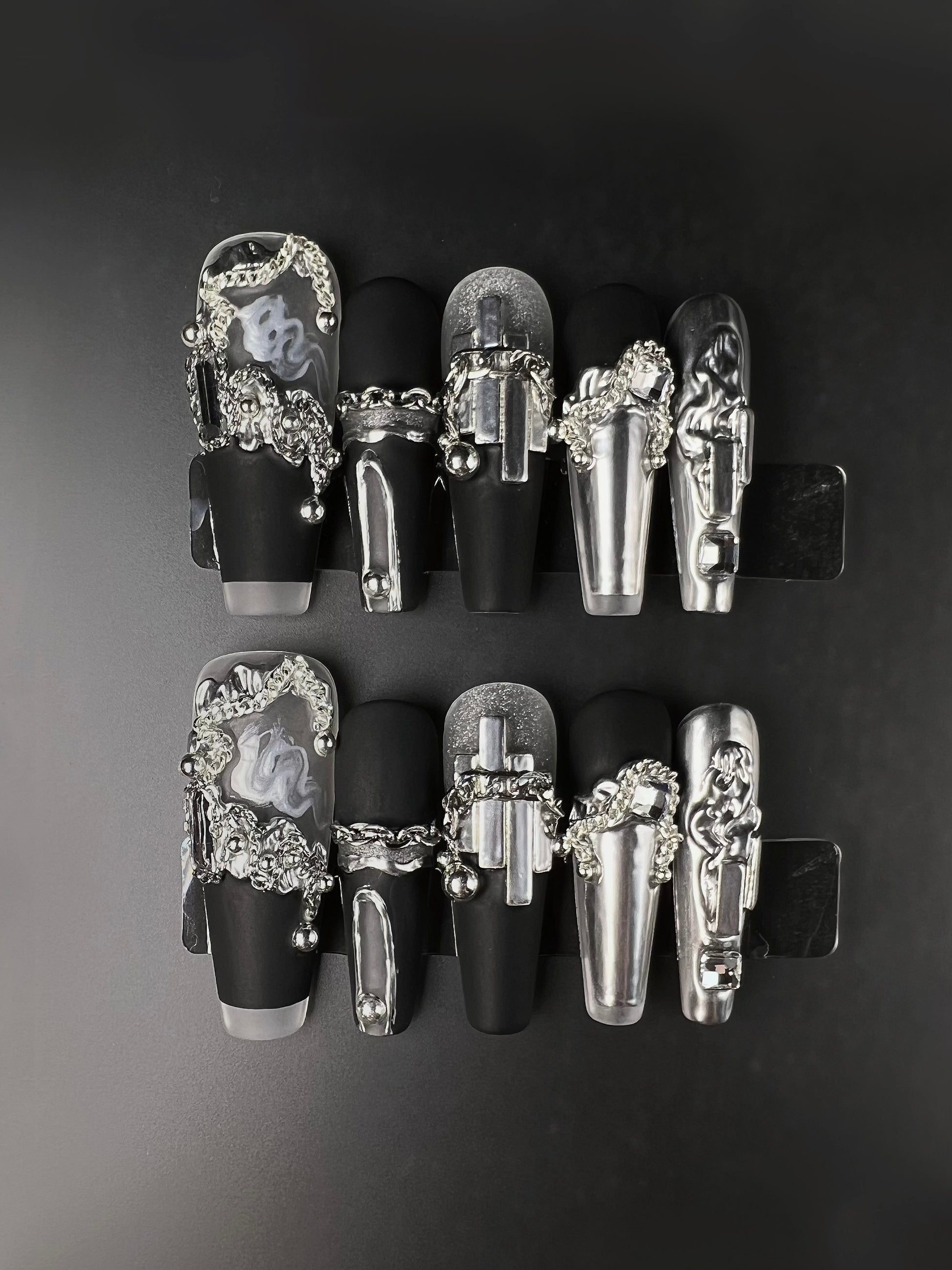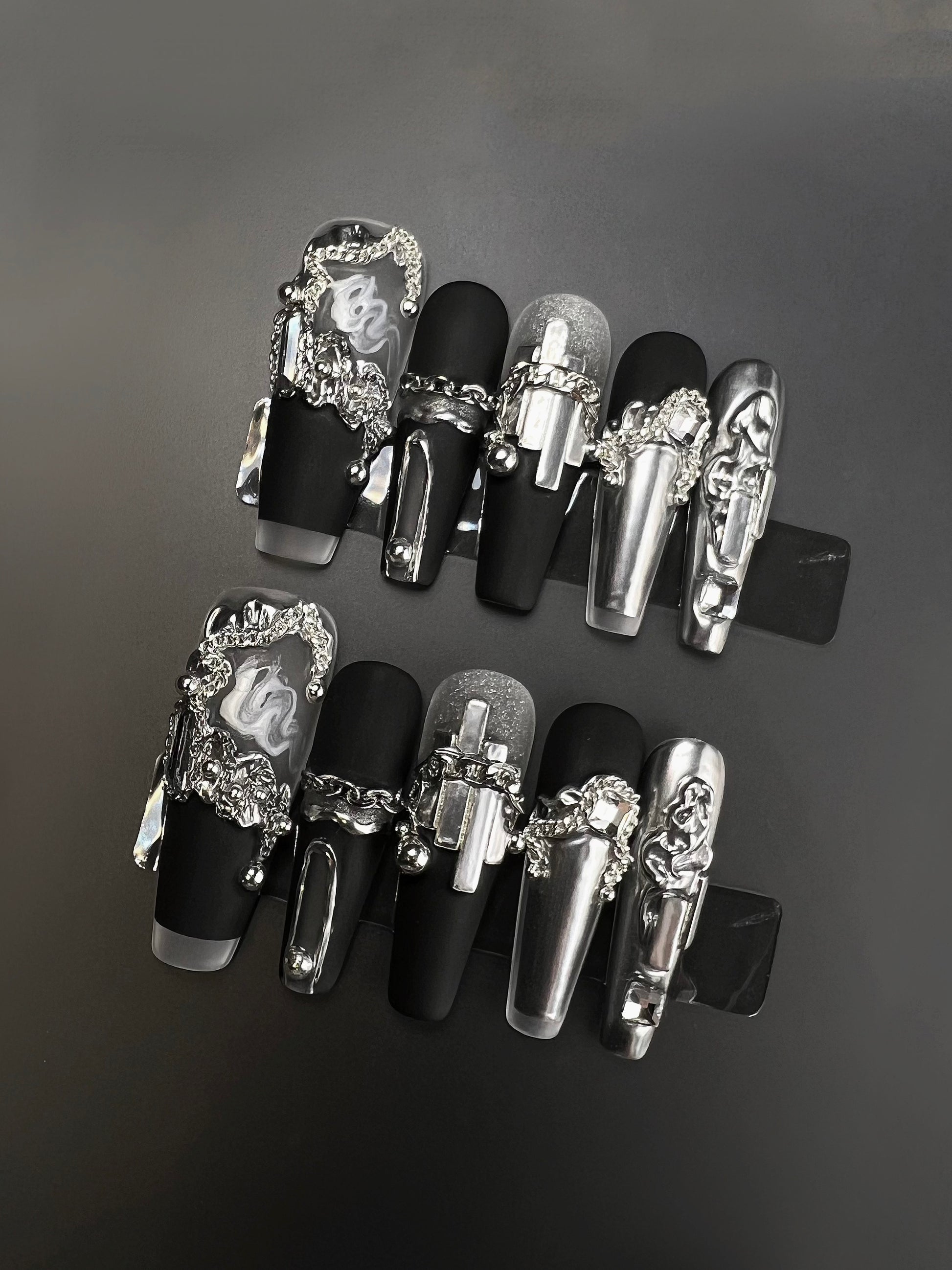 Exquisite hand-painted press-on nails crafted with passion by skilled nail technicians.